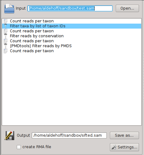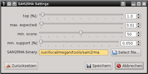 SamSifter can automatically create a RMA file from SAM output files if a recent version of MEGAN (version 5.8.3 or newer) including the SAM2RMA tool is installed on your computer. The tool can be configured by clicking the [Settings...] button.