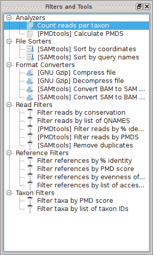 SamSifter includes a suite of built-in filters as well as wrappers for external tools which are characterized by the name of the underlying tool in square brackets (eg. [SAMtools] or [PMDtools]). All of the built-in filters and also some of the wrappers share a set of general options: