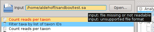 SamSifter automatically checks if the file a) exists, b) is readable and c) has the correct file type. The text field containing the file path will be highlighted in orange to show you if any of these conditions are not fulfilled. Hovering the mouse cursor over the text field shows a tooltip with hints how to resolve the error.