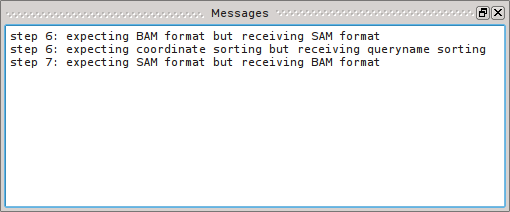 SamSifter validates the entire workflow after each change. Individual steps in the workflow may have specific requirements for the type of input they accept and/or the type of output they produce. If any of these requirements are not fulfilled the color of the corresponding entry will change to orange and a message will appear in the Messages dock with hints on how to resolve these errors.