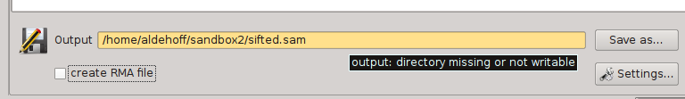 SamSifter supports output files in the SAM and BAM formats, both compressed and uncompressed. The output file can either be determined by typing the full path into the text field or by clicking the [Save as...] button and selecting the new filename using a standard file save dialog.