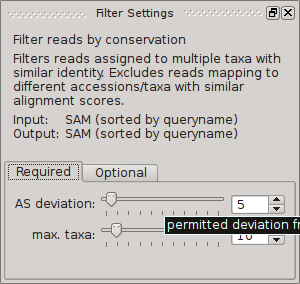 This filter identifies reads mapping to the references of multiple taxa with similar alignment scores. It is useful when dealing with reads mapping to highly conserved or orthologous genes that are shared across multiple taxa. The filter requires you to specify the permitted deviation from the maximal alignment score (default is 5) and the maximum number of taxa that a read can be mapped to within this range of alignment scores before it gets excluded (default is 10).