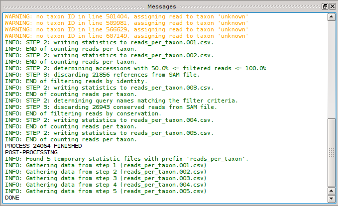 Each of these steps will create a temporary CSV file that is removed once the data have been automatically compiled into a spreadsheet at the end of a workflow. The tool responsible for this compilation is called compile_stats. By default it is included in the post-processing of every SamSifter workflow. It produces one CSV file for each analysed SAM file with tab-separated columns: the first column contains the taxon IDs, the following columns the read counts - one for each analysis step that was included in the workflow. If no temporary files are found it does nothing.
